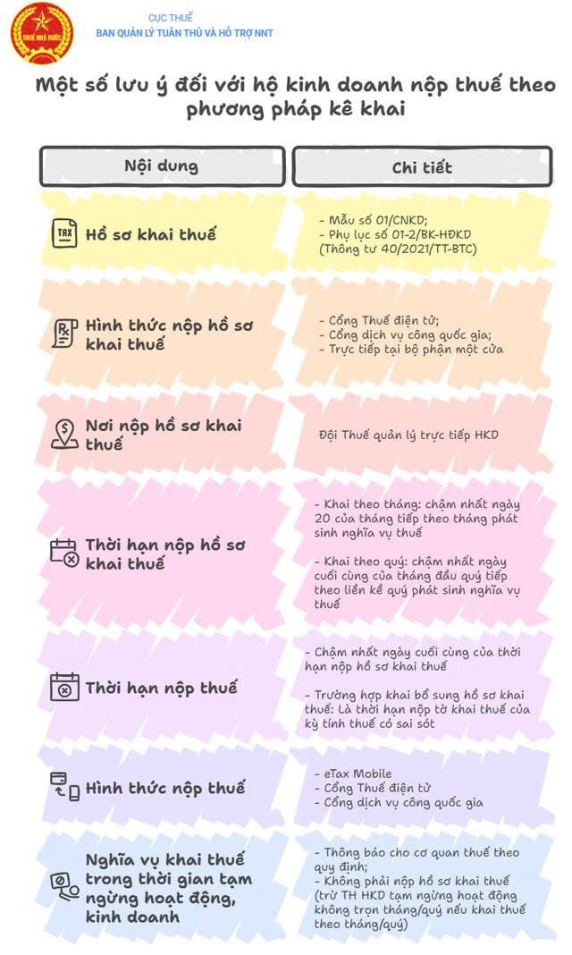 | Kê khai doanh thu | Kê khai 2 lần/năm. (đầu năm và giữa/cuối). | Kê khai theo quý (4 lần/năm), kèm quyết toán cuối năm. |